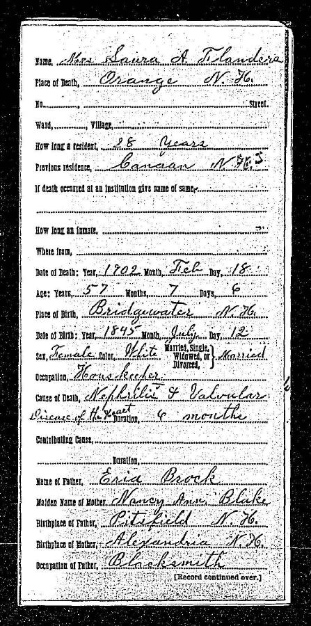 - [S357] The Church of Jesus Christ of Latter-day Saints. "New Hampshire Death Records, 1654-1947." Online database and image at http://www.familysearch.org. Laura A. Mrs. [sic] Flanders record.