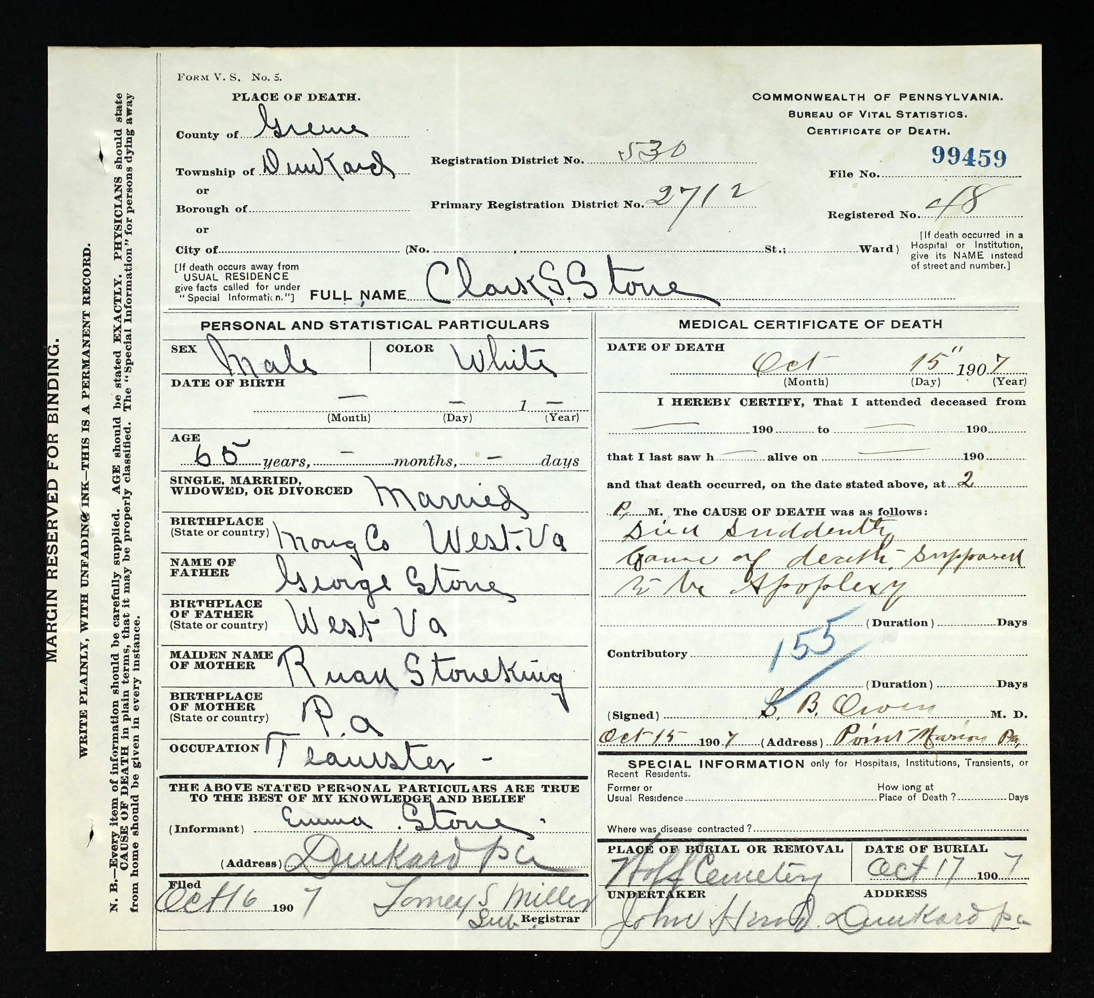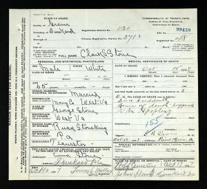 - [S449] "Pennsylvania, Death Certificates, 1906-1924." Online database at http://www.ancestry.com. Clark S Stone record.