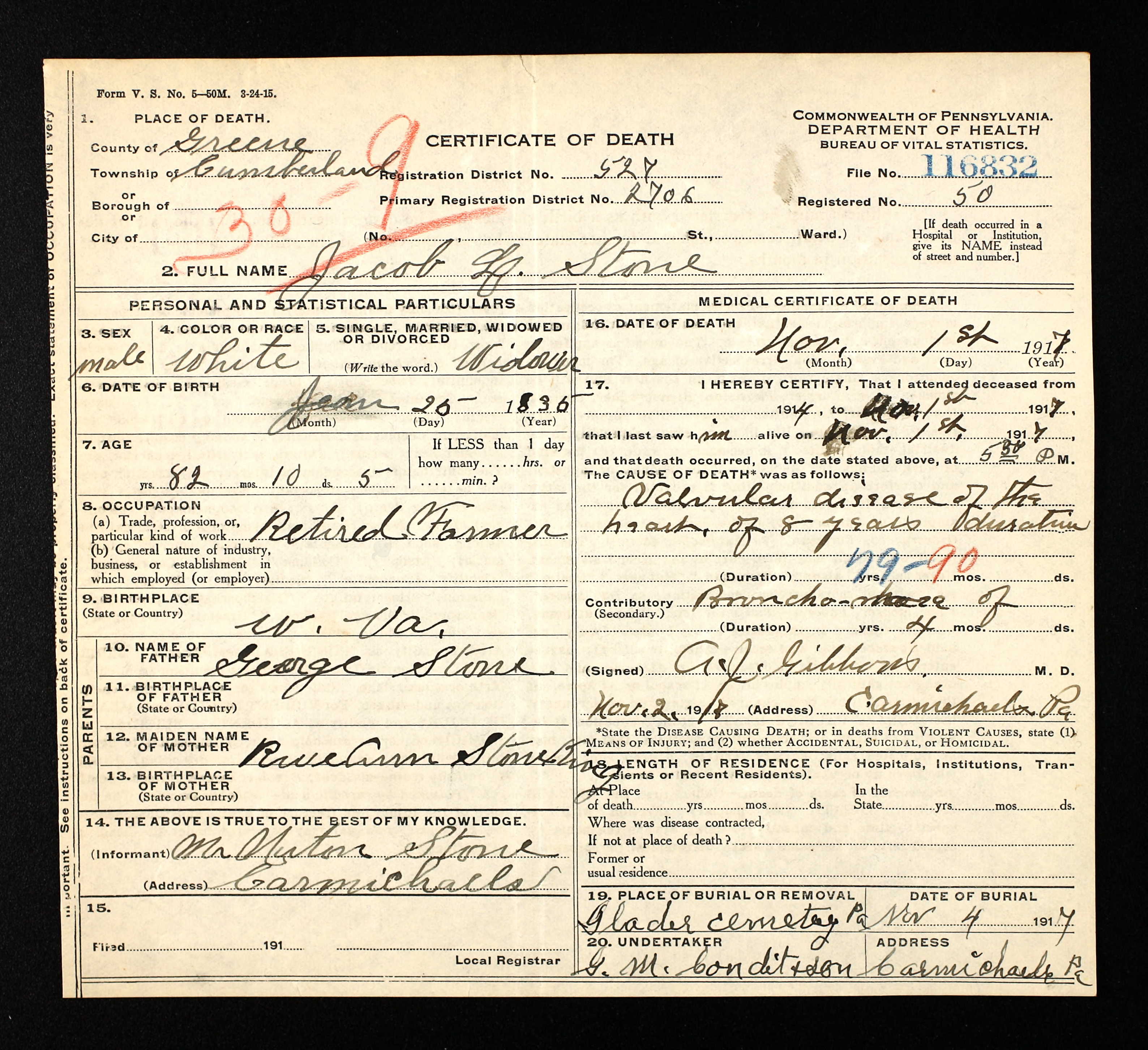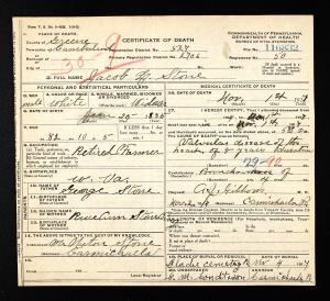 - [S448] "Pennsylvania, Death Certificates, 1906-1924." Online database at http://www.ancestry.com. Jacob L Stone record.